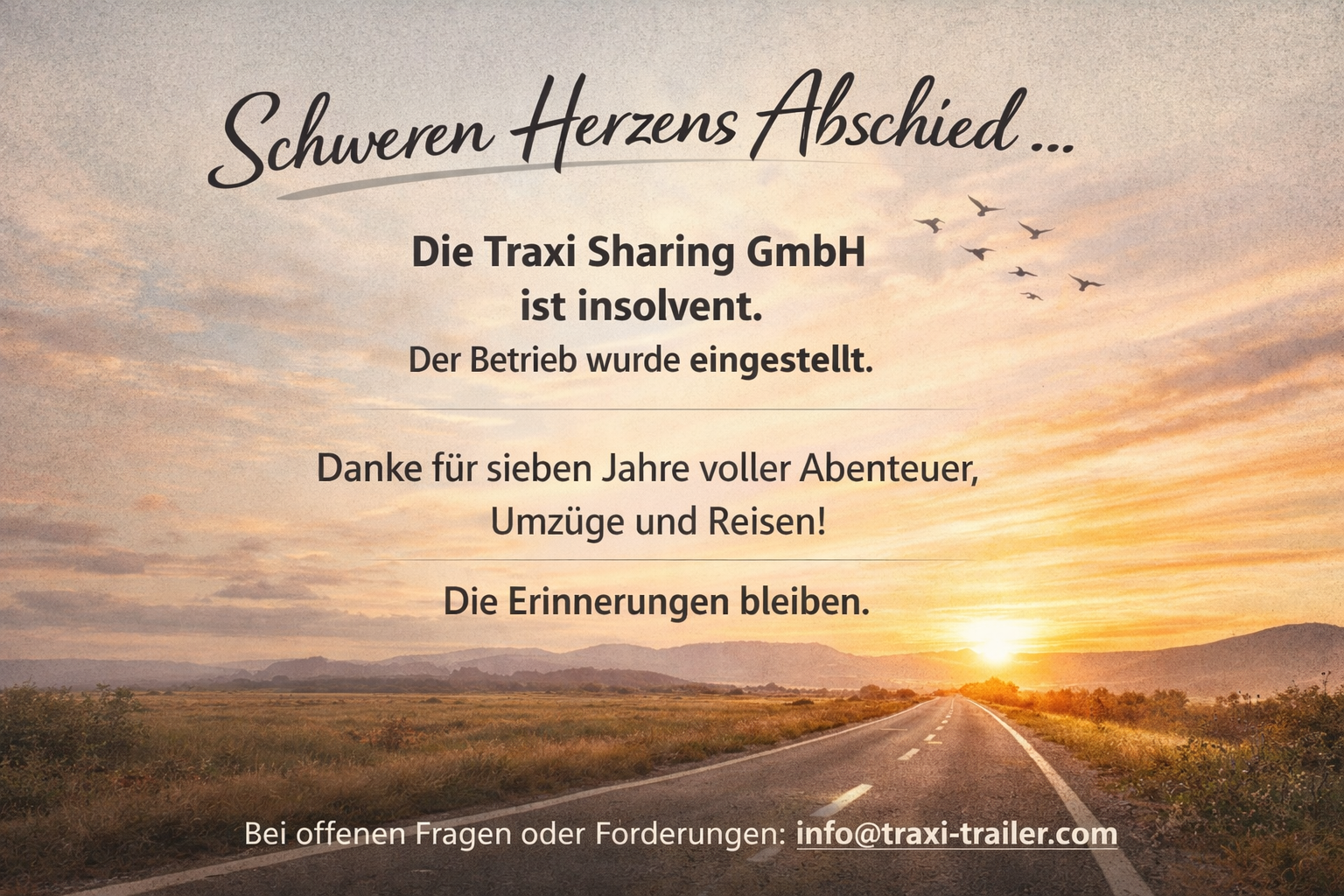 Sollten noch offene Anliegen oder Forderungen bestehen, wendet euch bitte per E-Mail an: info@traxi-trailer.com